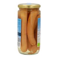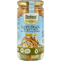 73% Geflügelfleisch* (Pute*, Huhn*)*, Trinkwasser, 10% Sonnenblumenöl*, Geflügelhaut*, Meersalz, Gewürze* (Pfeffer*, Ingwer*, Knoblauch*, Koriander*, Kümmel*), Dextrose*, Schafsaitling, Buchenholzrauch.| Energie | Fett | gesättigte Fettsäuren | Kohlenhydrate | Zucker | Eiweiss | Salz |