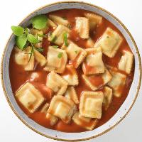 57 % Tomatensauce (Trinkwasser, 6,6 % Tomatenmark*, Rohrohrzucker*, 1,4 % Tomatenpulver*, Steinsalz, Maisstärke*, WEIZENMEHL*, Sonnenblumenöl*, Zwiebeln*, Karotte*, Gewürze* (Macis*, Curcuma*, Pfeffer*, Knoblauch*), Kräuter* (Liebstöckel*, Petersilie*, Rosmarin*, Oregano*), Verdickungsmittel: Guarkernmehl*), 43 % Ravioli gekocht [Nudelteig (HARTWEIZENGRIESS*, Trinkwasser), fleischhaltige Füllung (15 % Schweinefleisch*, HAFERFLOCKEN*, Sonnenblumenöl*, Meersalz)]| Energie | Fett | gesättigte Fettsäuren | Kohlenhydrate | Zucker | Ballaststoffe | Eiweiss | Salz |