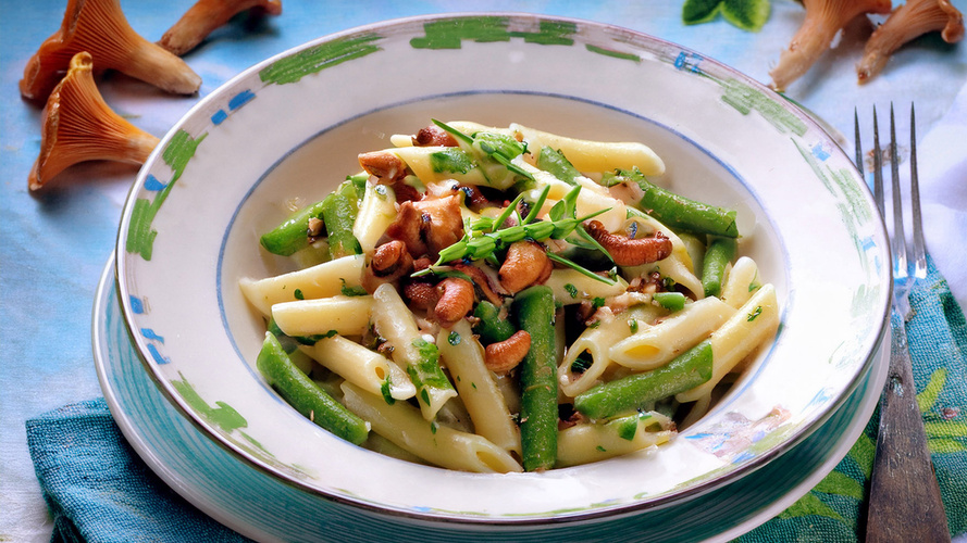 Pasta e fagioli mit Buschbohnen und Pfifferlingen