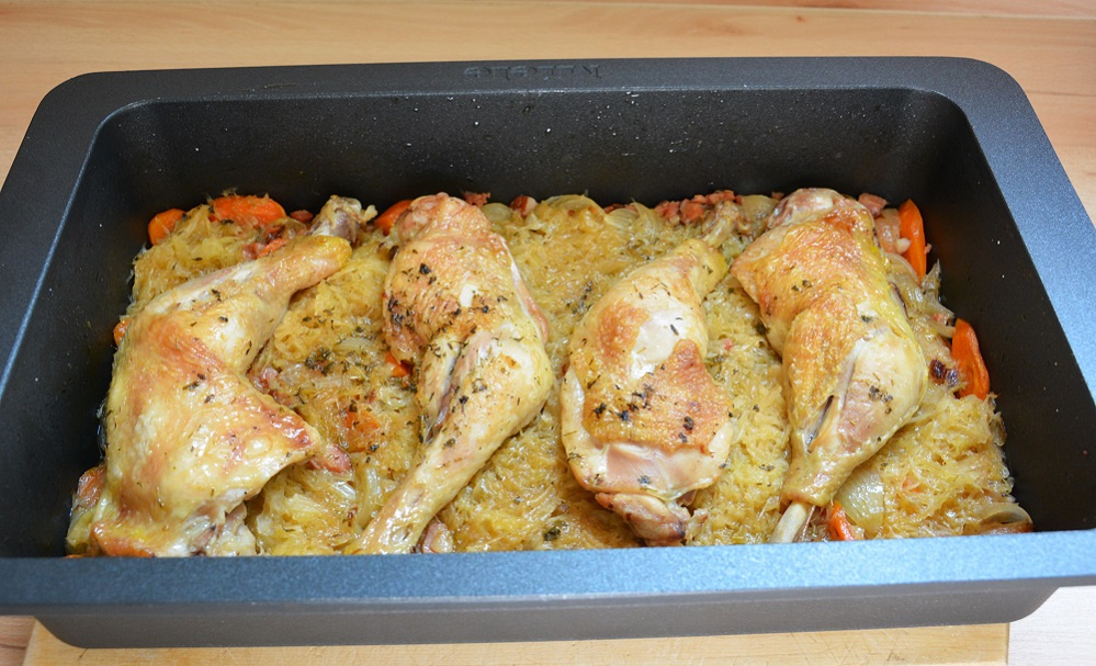 Zwiebeln, Möhren und Thymian zugeben und 5 Minuten braten. Sauerkraut und Räucherspeck im Bräter mit dem Gemüse mischen. Weißwein und 100ml Wasser zugießen und aufkochen. Mit Salz und Pfeffer würzen. Hähnchenstücke auf das Gemüse legen. Im heißen Ofen bei 200°C Ober- und Unterhitze im unteren Ofendrittel zugedeckt 25 Minuten schmoren. Dann offen weitere 25 Minuten garen.